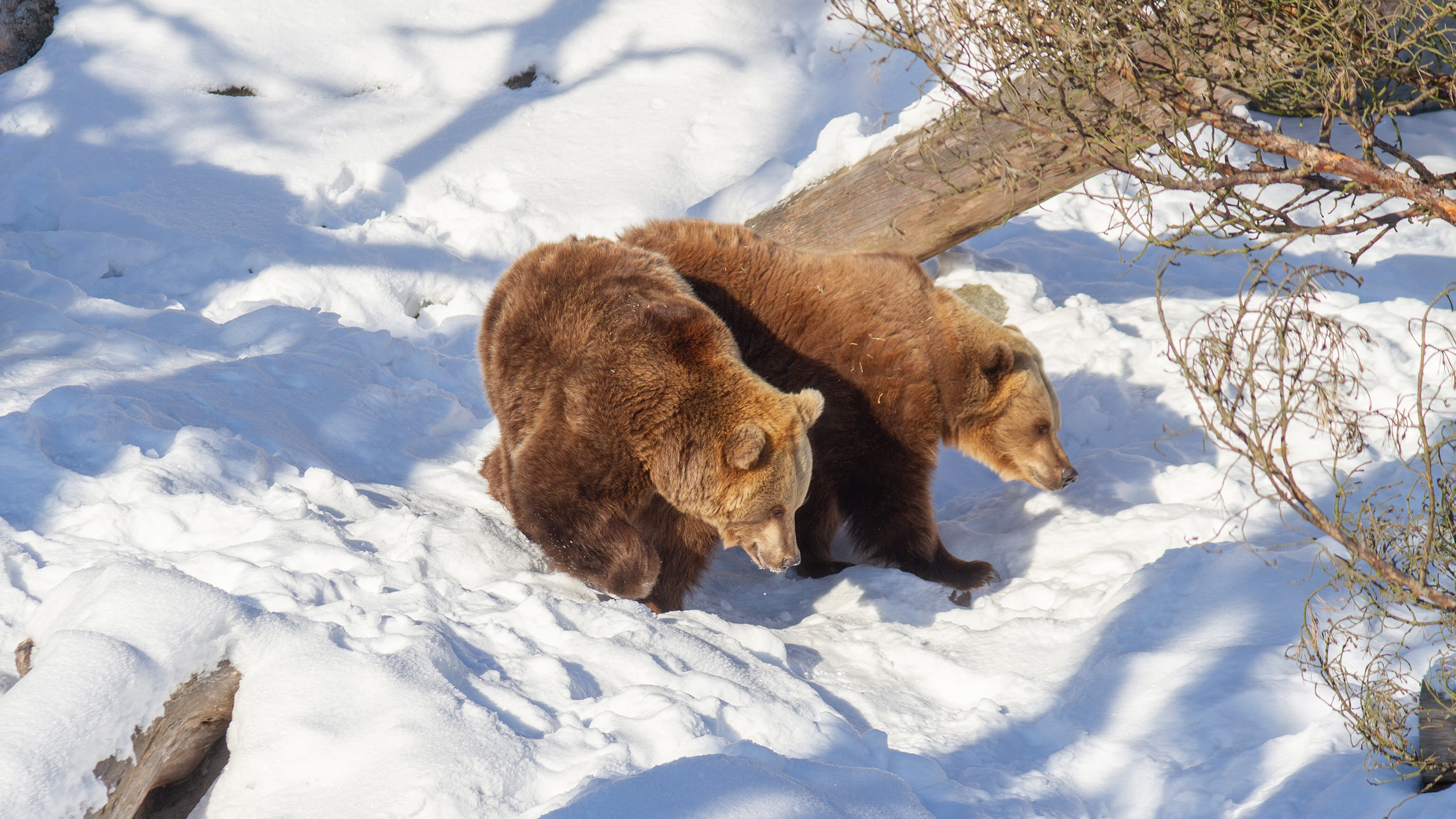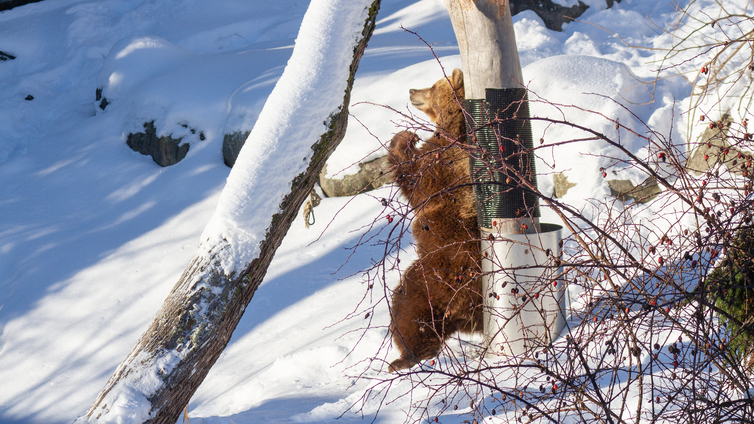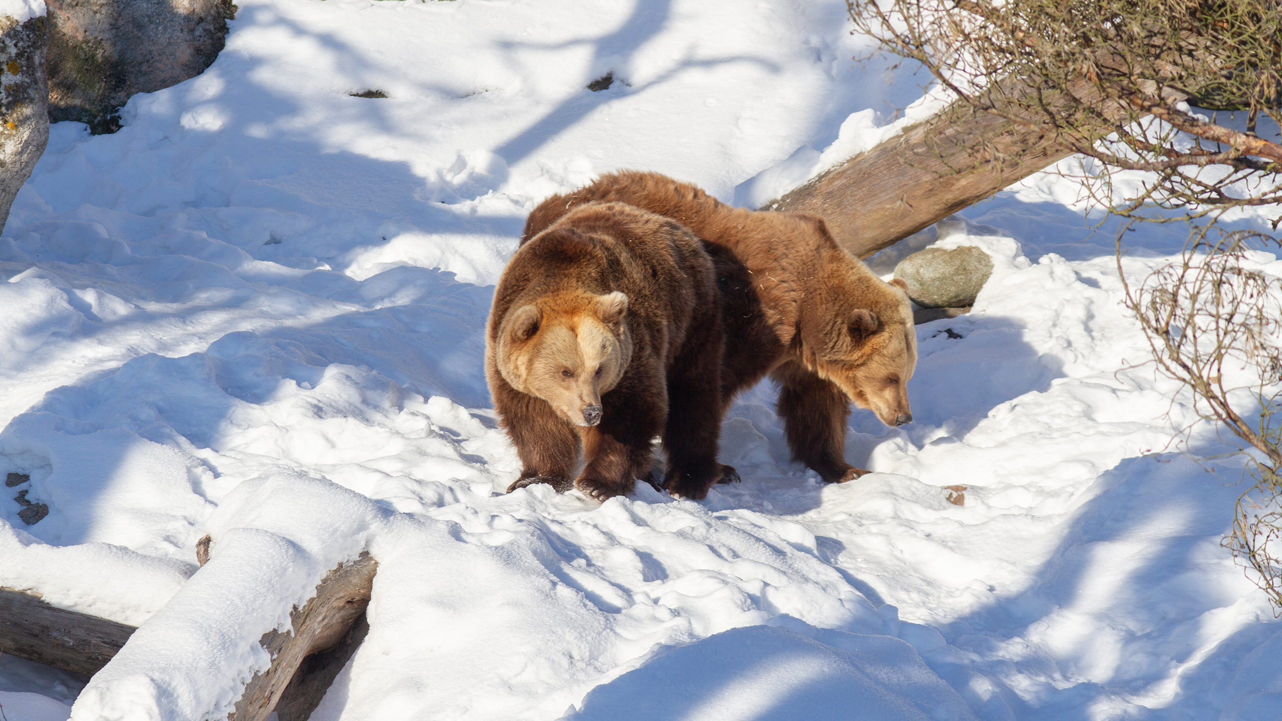 Karhut pääsevät päivittäin ulkoilemaan ja tutkimaan lumista tarhaansa. Ne rapsuttelevat talviturkkejaan puiden runkoihin, kierivät lumessa ja nuuhkivat tuoksuja lumen alta. Karhut ovat edelleen väsyneitä, joten ne viettävät vielä ison osan päivästään lepäillen pesissään, jonne ne saavat talvirientojensa jälkeen kömpiä.