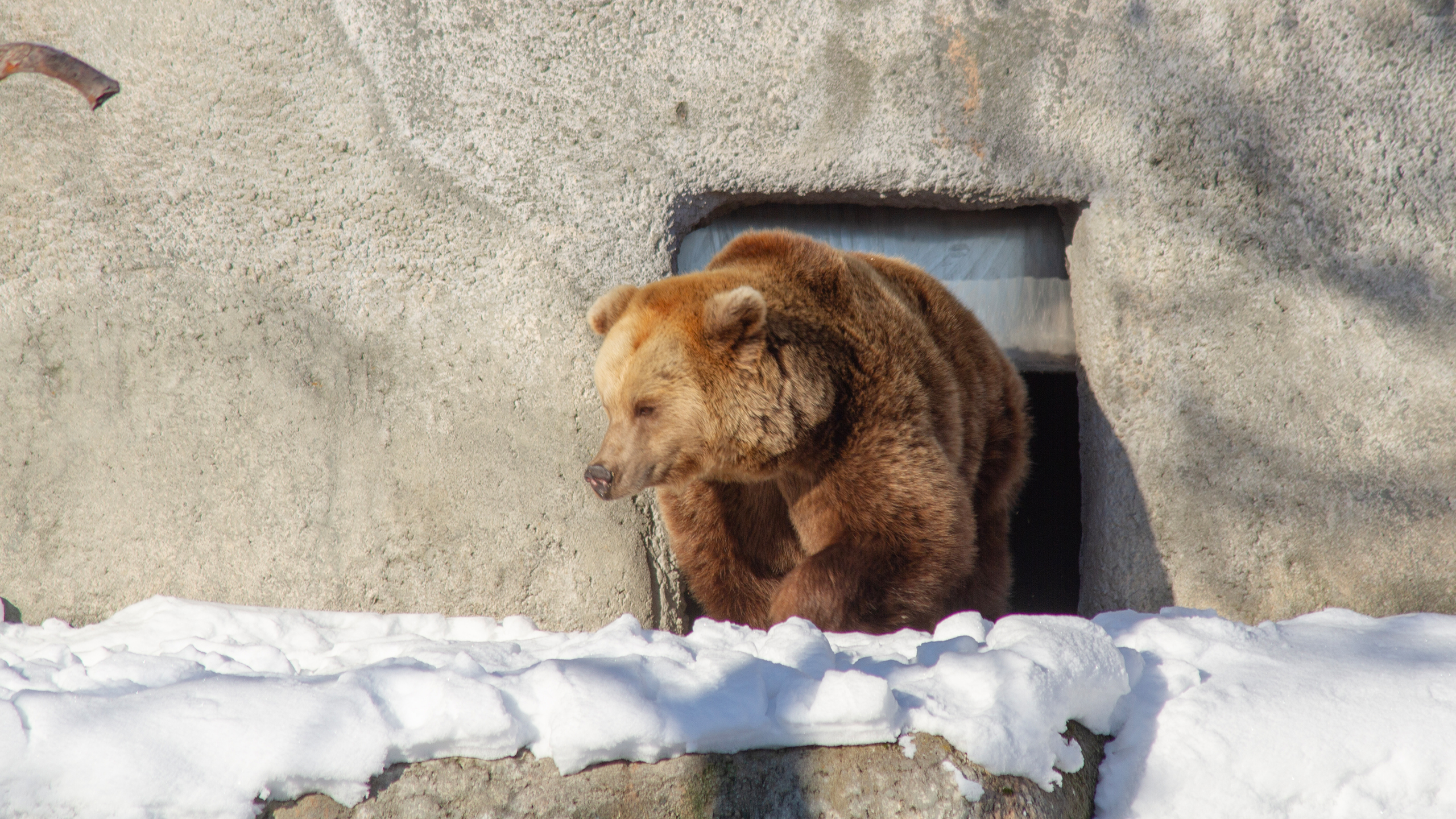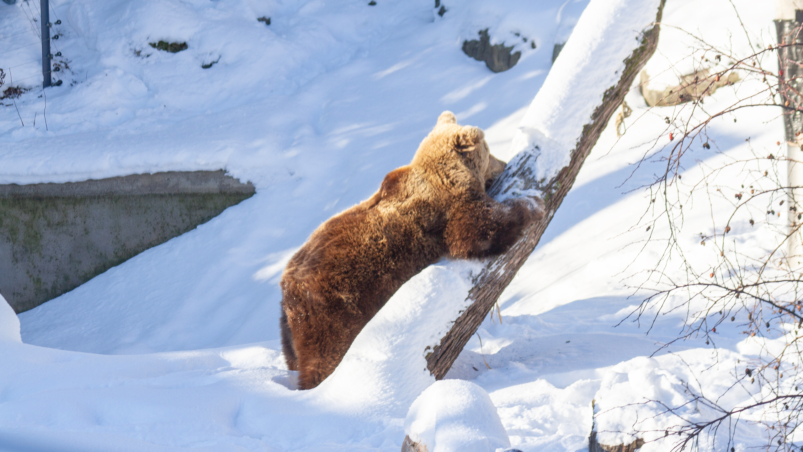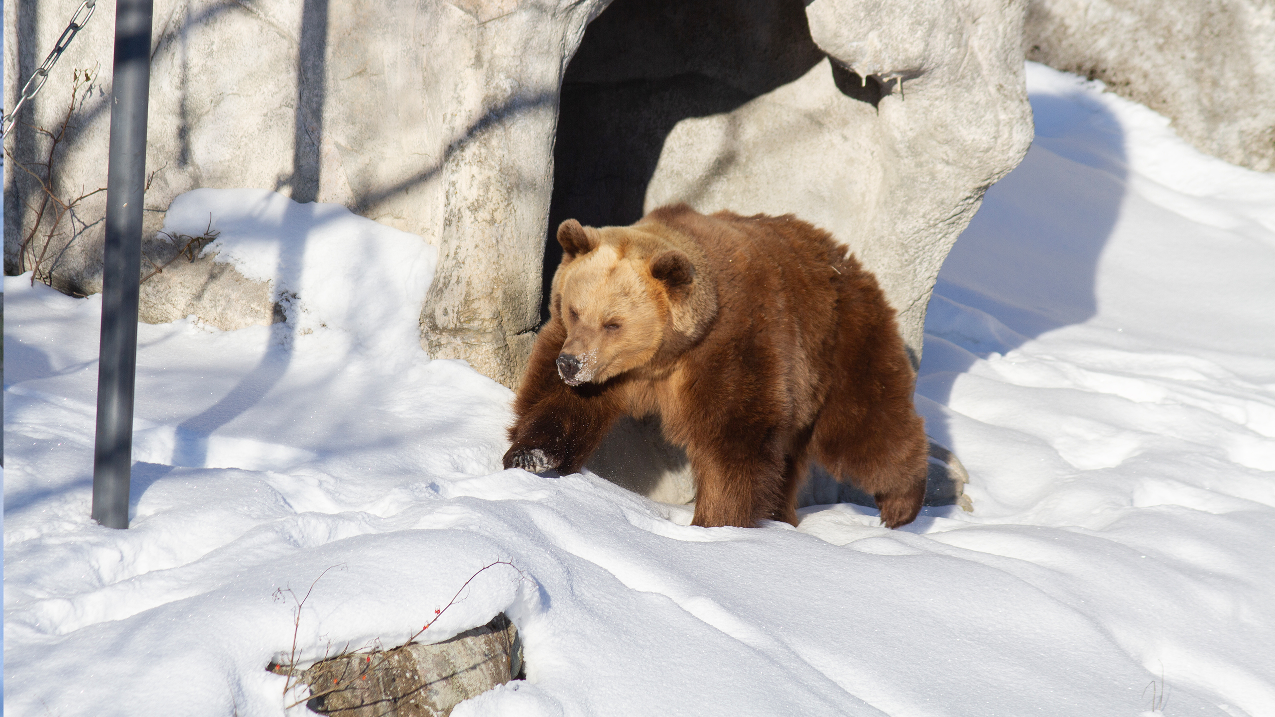Karhut pääsevät päivittäin ulkoilemaan ja tutkimaan lumista tarhaansa. Ne rapsuttelevat talviturkkejaan puiden runkoihin, kierivät lumessa ja nuuhkivat tuoksuja lumen alta. Karhut ovat edelleen väsyneitä, joten ne viettävät vielä ison osan päivästään lepäillen pesissään, jonne ne saavat talvirientojensa jälkeen kömpiä.